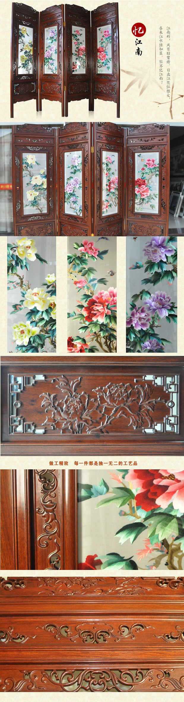 【產(chǎn)品名稱】:四扇牡丹屏風(fēng)(雙面繡) (作品代碼:zp-1501) 【產(chǎn)品規(guī)格】:圖案尺寸每扇寬度35cm,高度90cm 外框整體尺寸寬60cm,高205cm 【產(chǎn)品工藝】:手工刺繡 【產(chǎn)品材質(zhì)】:真絲面料+紅木+桑蠶絲線+玻璃 【產(chǎn)品包裝】:木箱包裝,用海綿包扎,確保運(yùn)輸安全 【出廠價(jià)】:39800元 【產(chǎn)品運(yùn)輸】:我司負(fù)責(zé)發(fā)往客戶指定地點(diǎn),蘇州附近城市可送貨上門! 【產(chǎn)品說明】:牡丹雙面繡折疊屏風(fēng),是由蘇州工藝師耗時(shí)數(shù)個(gè)月精心手工刺繡而成,刺繡圖案以牡丹花為題材繡工精細(xì),顏色搭配均勻過渡自然,屏風(fēng)的框架選用進(jìn)口的緬甸紅木為料,是蘇繡屏風(fēng)中的珍稀作品。是居家和辦公的重要裝飾品之一!歡迎親臨嬌古蘇繡展示廳觀看實(shí)物!